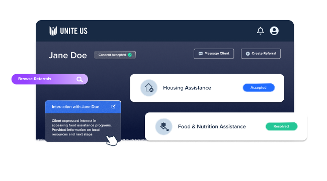 Managing referrals can feel like a balancing act — juggling client needs, partner expectations, and endless follow-ups. Unite Us takes the chaos out of the process, so you can focus on making a real difference. Our platform streamlines the entire process, from creating referrals to tracking outcomes, helping your clients connect with the right services with ease.